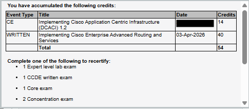 ちょっと前にDCACIのトレーニング受講で14 CEクレジット獲得していたので、あと66 CEクレジット獲得したらCCIE更新です(120 CEクレジットでCCIE更新)。CE クレジットは3年間保有できるので、計画的に進めることをお勧めします…!